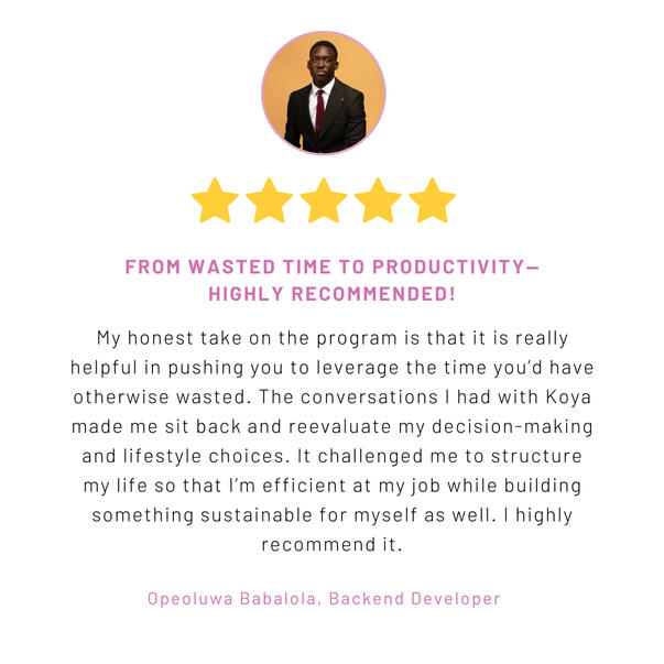 Hey there! I’m Koya, a software engineer with a passion for helping professionals create time for their dreams and side hustles. I’ve balanced my job with my passions, and now, I’m here to help you do the same with the Passion Pursuit Playbook for Professionals.The Passion Pursuit Playbook for Professionals is your ultimate guide to mastering time management, balancing personal obligations, and building your dream life without sacrificing your 9-5 job. This playbook is packed with actionable strategies, real-life exercises, and practical advice to help you manage distractions, enhance efficiency, and reclaim your time for what truly matters.